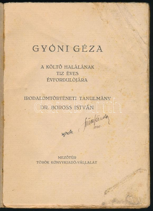 Description: Boross István: Gyóni Géza. A költő halálának tíz éves évfordulójára. Irodalomtörténeti tanulmány. Mezőtúr, [1927], Török Könyvkiadó-Vállalat. 91p. Kiadói papírkötésben.