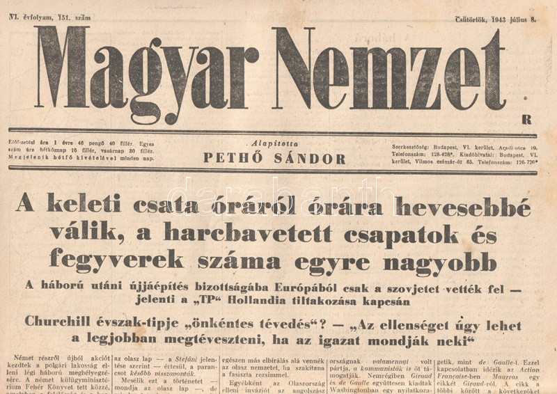[II. Világháború] Magyar Nemzet. Pethő Sándor riportlapja. VI. évfolyam, 151. szám. (Napilap, 1943 július 8.) "A keleti csata óráról órára hevesebbé válik, a harcbavetett csapatok és fegyverek száma egyre nagyobb -- A háború utáni újjáépítés bizottságába Európából csak a szovjetet vették fel - jelenti a "TP" Hollandia tiltakozása kapcsán -- Churchill évszak-tippje "önkéntes tévedés"? - "Az ellenséget úgy lehet a legjobban megtéveszteni, ha az igazat mondják neki" -- A háború -- Meglepő német sikerekkel egyre fokozódik a kurszki csata -- A londoni belga kormány igazságügyminisztere az invázióról -- Berlini tudósítónk telefonjelentése -- Martinique Algirhoz csatlakozott -- Zürichi tudósítónk telefonjelentése a háborúról -- Zürichi tudósítónk telefonjelentése a külpolitikáról -- Párizsban megindult a század legbizarrabb pere ezer levél miatt".