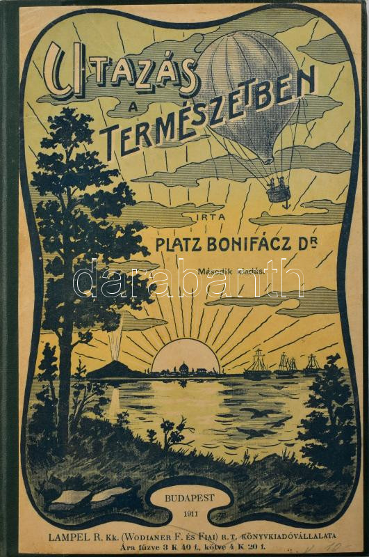 Platz Bonifác: Utazás a természetben. Bp., 1911, Lampel R. (Wodianer F. és Fiai Rt.), 2+VI+186+4 p. 2. kiadás. Szövegközti és egészoldalas illusztrációkkal. Átkötött félvászon-kötés, az eredeti szecessziós illusztrált elülső papírborítót a borítóra kasírozták.