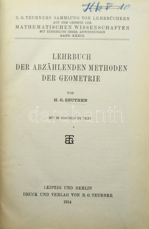 Zeuthen, H. G.: Lehrbuch der Abzählenden Methoden der Geometrie. Leipzig-Berlin, 1914, B. G. Teubner, XII+394 p. Német nyelven. Átkötött félvászon-kötés.