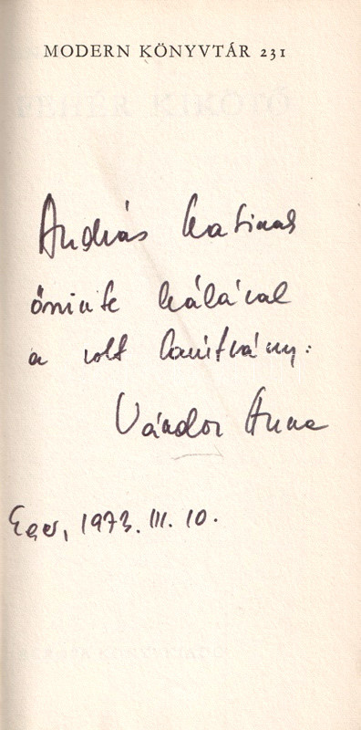 Dedikált: "András Katinak őszinte hálával a volt tanítvány: Vándor Anna. Eger, 1973. III. 10."