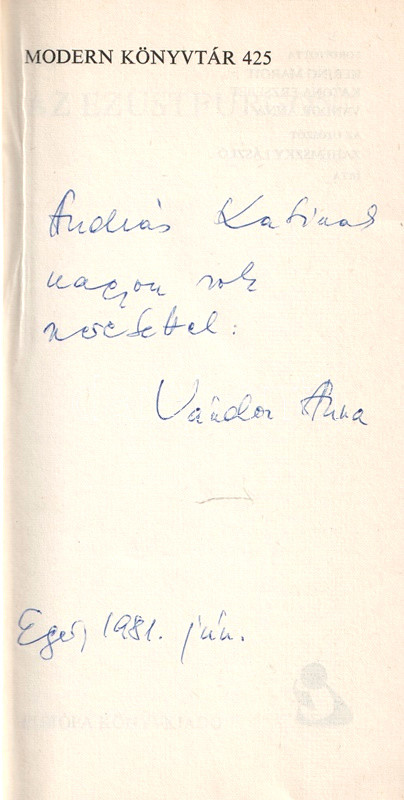 Dedikált: "András Katinak nagyon sok szeretettel: Vándor Anna. Eger, 1981. június".