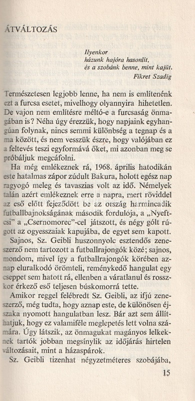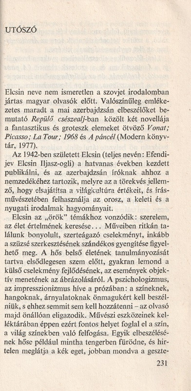 Elcsin Afandijev (1943-2025) azeri író, politikus, a szovjet éra után 1993-tól évtizedekig Azerbajdzsán miniszterelnök-helyettese. Kötetünkben közölt kisregényei és elbeszélései döntően Bakuban, az azeri SZSZK fővárosában játszódnak.