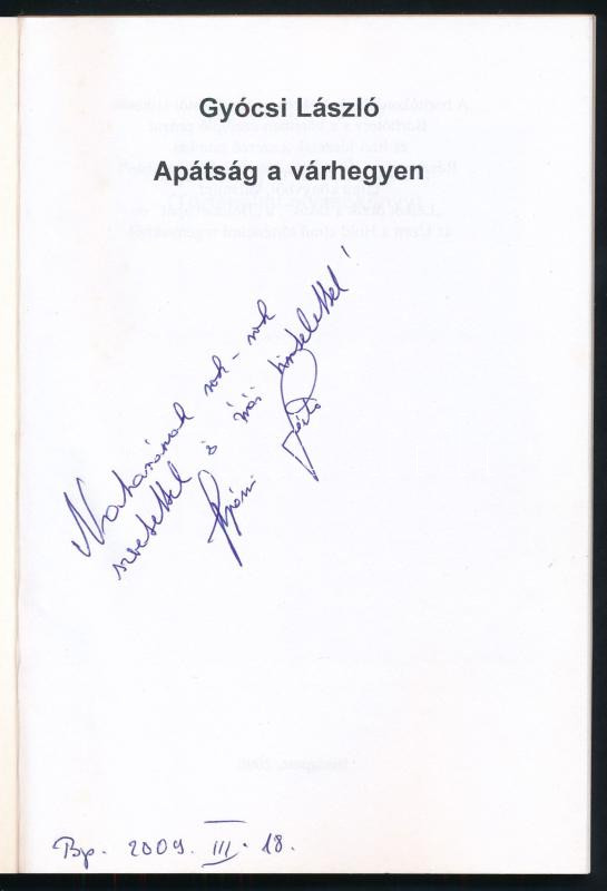 https://www.darabanth.com/en/506-Online-auction/506.0/Books/Books-Other-rarities~648/Gyocsi-Laszlo-Apatsag-a-varhegyen-DEDIKALT-Bp-2008-Kiadoi-papirkotes-jo-allapotb~II3430135