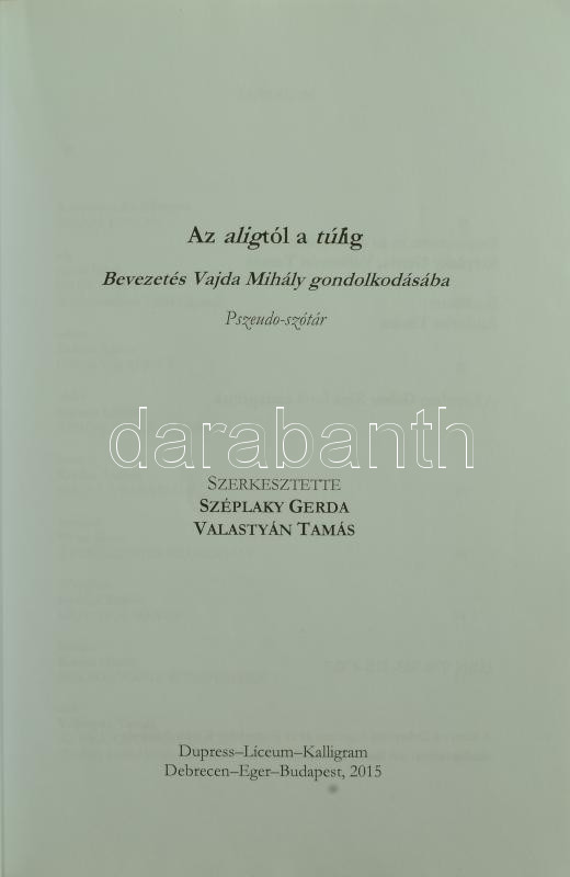 Széplaky-Valastyán (szerk.): Az aligtól a túlig. Bevezetés Vajda Mihál... https://www.darabanth.com/en/506-Online-auction/506.0/Books/Books-Other-rarities~648/Szeplaky-Valastyan-szerk-Az-aligtol-a-tulig-Bevezetes-Vajda-Mihaly-gondolkodasaba-Psze~II3429194