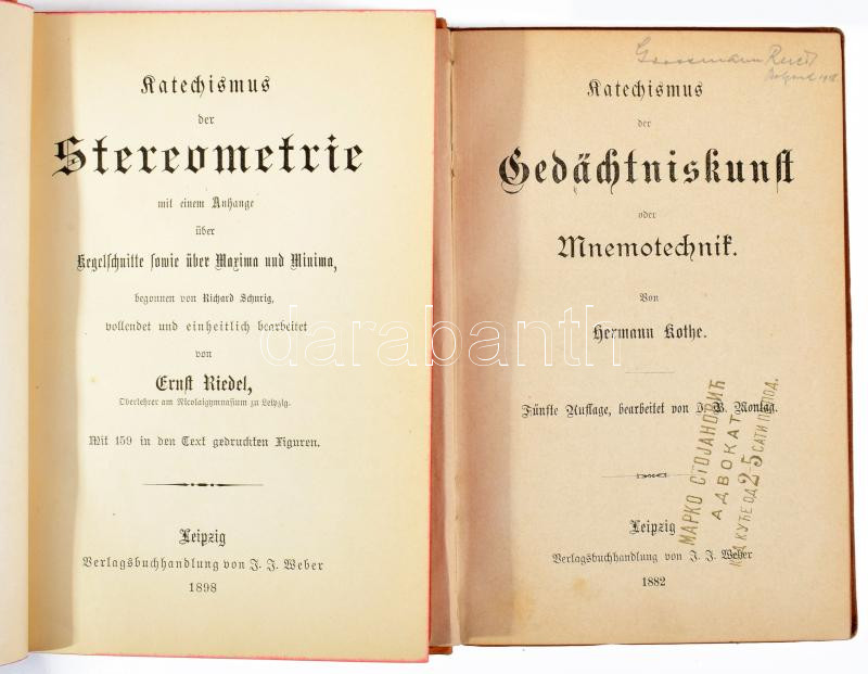 Ernst Riedel: Katechismus der Stereometrie. Leipzig, 1882 -1898, J. J. Weber. Német nyelven. Kiadói szecessziós egészvászon-kötés, kissé kopott borítókkal.