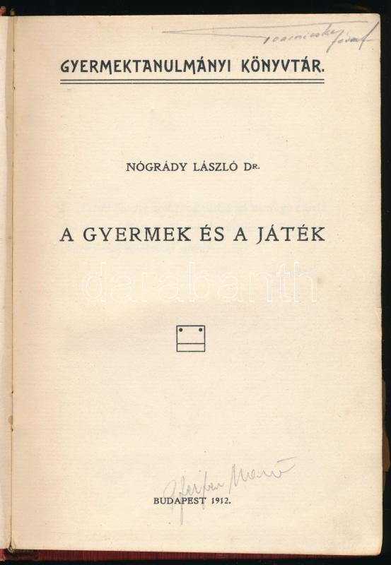 Nógrády László: A gyermek és a játék. Gyermektanulmányi Könyvtár. Bp., 1912, Magyar Gyermektanulmányi Társaság (Fritz Ármin-ny.), 301+(3) p. Első kiadás. Egészvászon-kötésben, kissé kopottas, fakó gerinccel, néhány kissé foltos lappal, a könyv végén két sérült, kijáró lappal.