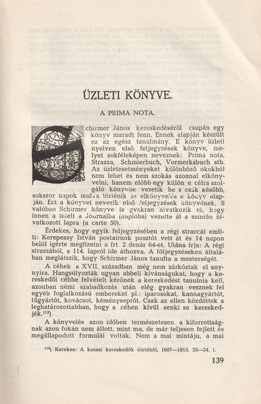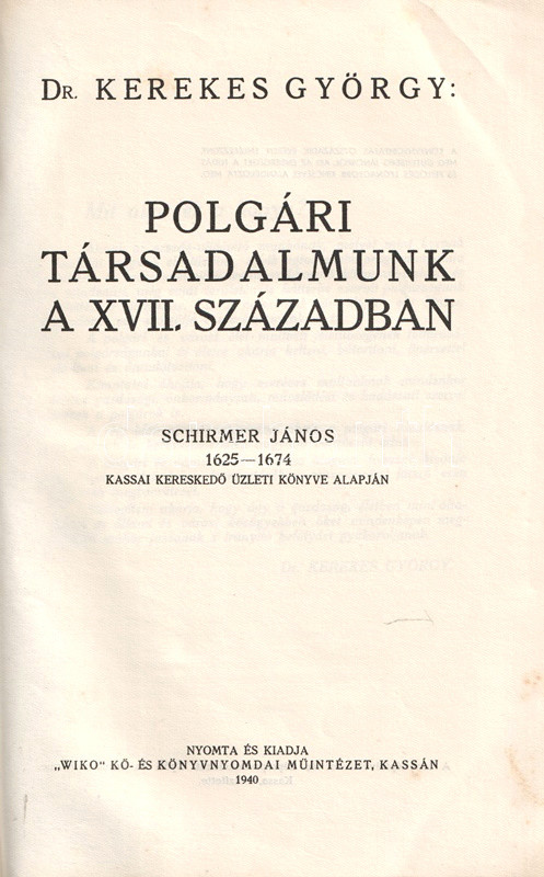 Kerekes György (1870-1947) tanár, iskolaigazgató, kassai gazdaságtörténész. Társadalomtörténeti áttekintése a jómódú kassai kereskedő, Schirmer János gazdasági feljegyzéseiből indul ki: körvonalazza polgárokból és patríciusokból, Kassa környéki főurakból álló vevőkörét. Schirmer János éppúgy kereskedett kelmékkel, mint könyvekkel, építőanyagokkal, salétrommal vagy éppen művészi kellékekkel. A társadalomtörténeti keretbe ágyazott mű az öntudatos, polgári hagyományokkal bíró Kassa korabeli társadalmi kapcsolatrendszeréről értékes részleteket oszt meg.