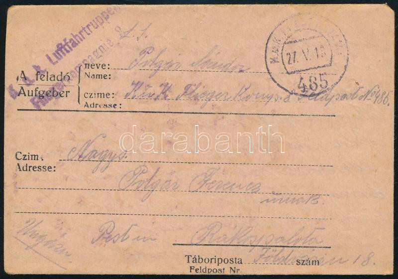 1918 Tábori posta levelezőlap "K.u.k. Luftfahrtruppen / Fliegerkompagnie 8." + "FP / 485"