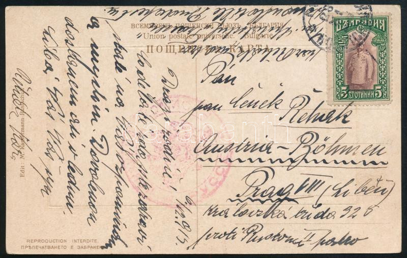 Description: 1915 Képeslap bulgár bélyeggel bérmentesítve, a feladó az S.M.S. Traisen legénységének a tagja, nagyrészt olvashatatlan piros bolgár cenzúrabélyegzéssel Russe-ból