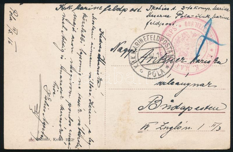 1916 Tábori posta képeslap "K.U.K. MATROSENKORPS / WACHABTEILUNG" + "MF / POLA"