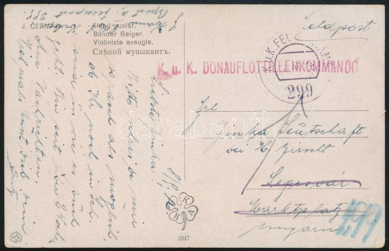 1916 Tábori posta képeslap Segesvárra, majd visszaküldve a feladónak, piros / red "K.u.K. DONAUFLOTTILLENKOMMANDO" , "K.u.K. FELDPOSTAMT 299"