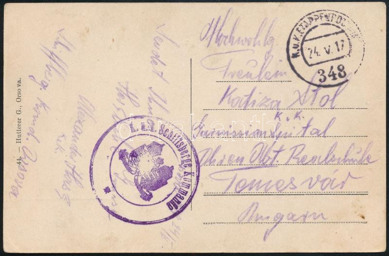 1917 Tábori posta Vaskapu képeslap Temesvárra küldve "K.u.k. Sschiffberge Kommando" , "K.u.K. ETAPPENFELDPOSTAMT / 348"