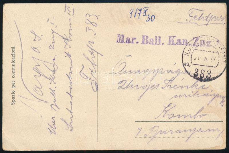 1917 Tábori posta levelezőlap "Mar. Ball. Kan. Zug(...)" + "FP / 383"