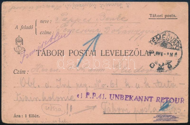 https://www.darabanth.com/en/506-Online-auction/506.0/Hungarian-philately-and-postal-history/Austro-Hungarian-fieldpost-WWI~39/7E1918-Levelezolap-tabori-posta-cimre-kuldve-majd-Ismeretlen-jelzessel-visszakuldve~II3138981