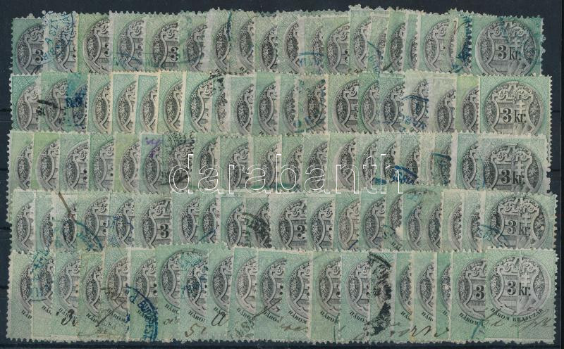 1868-1876 100 db 3kr okmánybélyeg papír-, vízjel-, fogazat- és nyomási változatokkal, válogatás nélkül (dr. Kiss hagyaték)