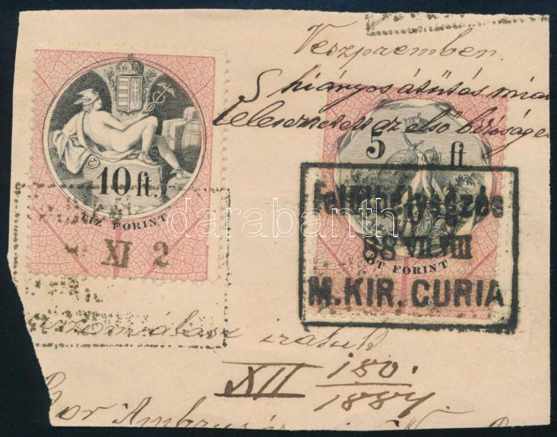 1888 Okmánydarab 10ft + 5ft okmánybélyeggel, "M. KIR. CURIA"...