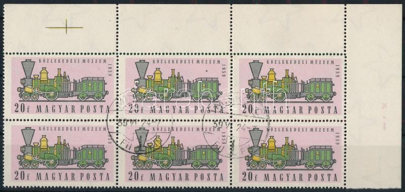 1959 Közlekedési múzeum 20f hatostömb nagy festékfolttal a felső közép...