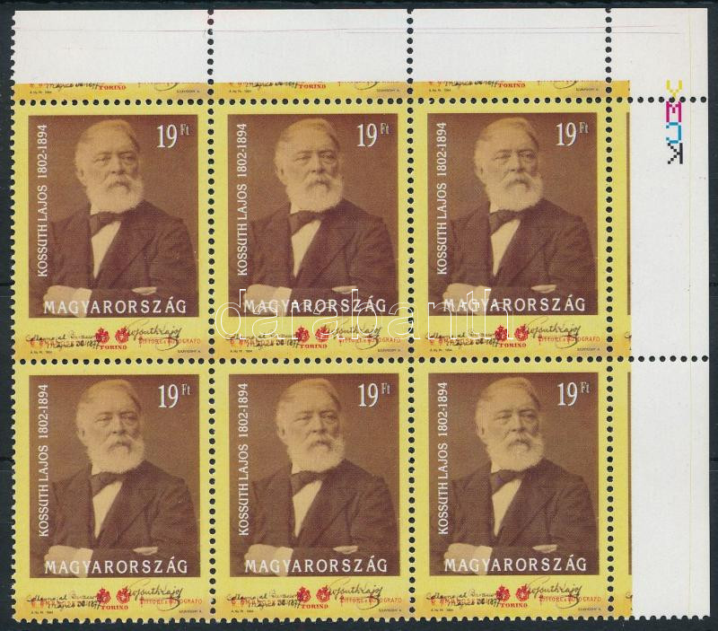 1994 Kossuth Lajos III. ívsarki hatostömb ívszélre kifutó bélyegképpel...