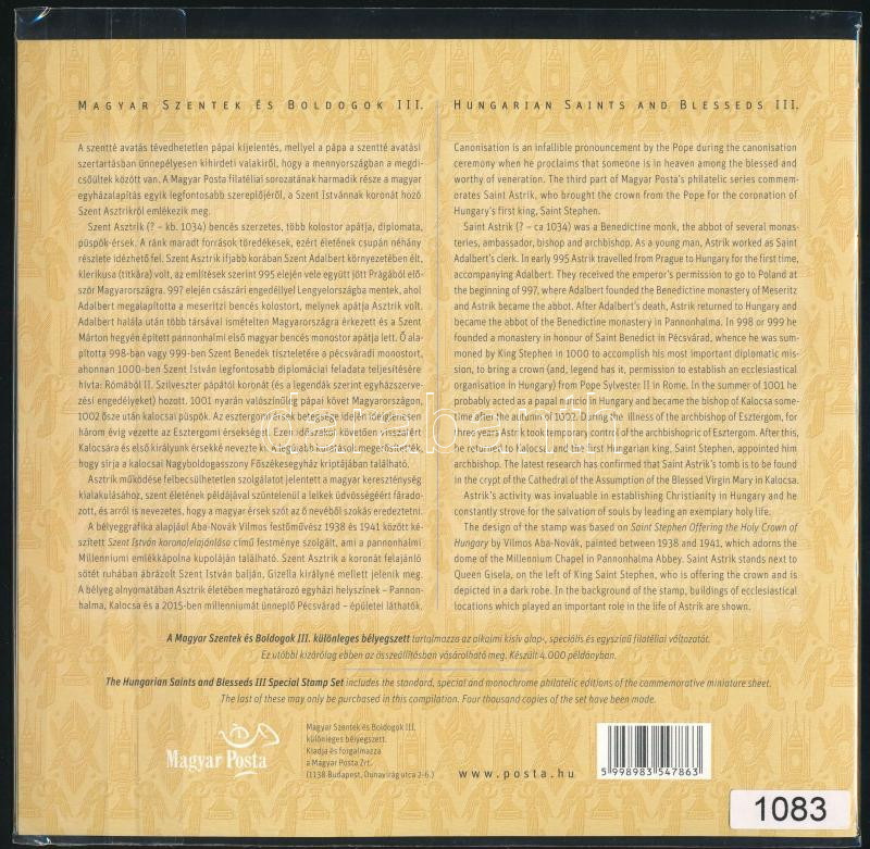 https://www.darabanth.com/en/506-Online-auction/506.0/Hungarian-philately-and-postal-history/Issues-between-2010-2019~58/2015-Magyar-Szentek-es-Boldogok-III-Szent-Asztrik-belyegszett-eredeti-csomagolasban-No-1083~II3433629