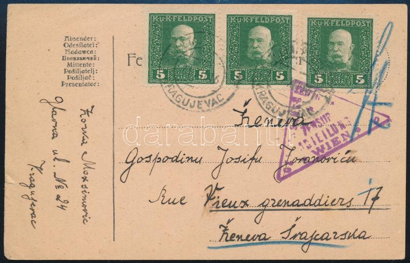 1916 Tábori posta levelezőlap 3x5H bérmentesítéssel, cenzúrázva, "K.u.K. ETAPPENPOSTAMT / KRAGUJEVAC"
