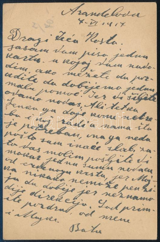 https://www.darabanth.com/en/506-Online-auction/506.0/Hungarian-philately-and-postal-history/KuK-Feldpost~38/1917-8H-Dijjegyes-levelezolap-15H-dijkiegeszitessel-KuK-ETAPPENPOSTAMT-ARANGJELOVAC~II3167121