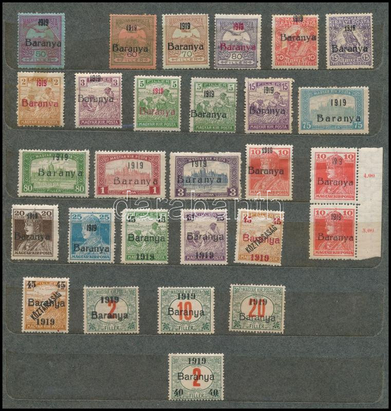 Baranya 1919 28 db bélyeg, közte antikva számok és lemezhibák is, Bodo...