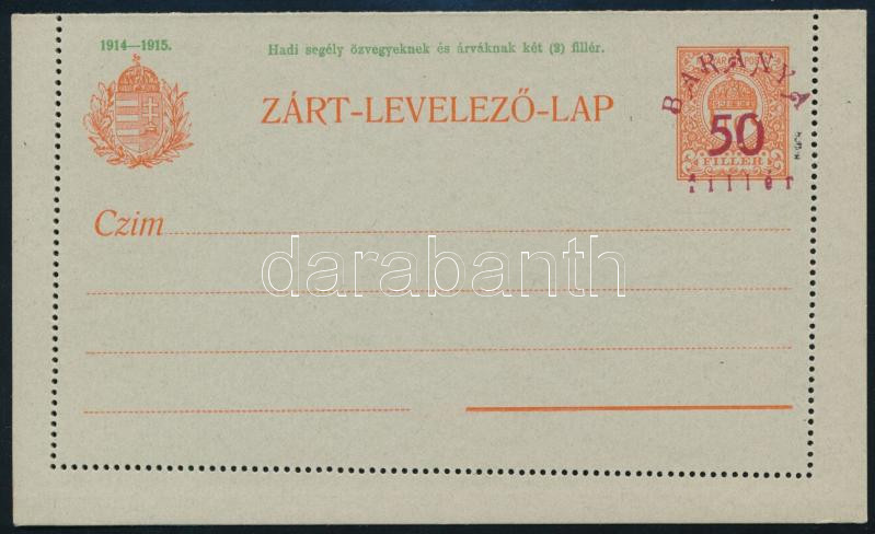 Baranya 1919 Használatlan 50f díjjegyes zárt levelezőlap, Bodor vizsgá...