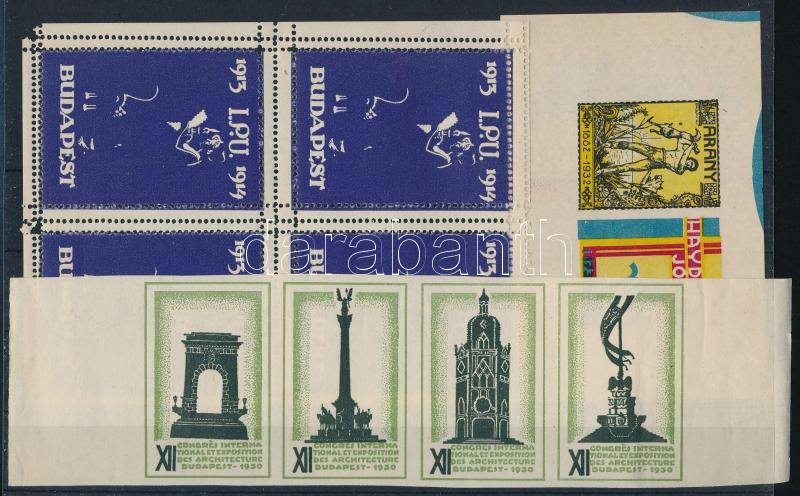 1914-1920 3 db klf levélzáró tömb, összefüggés: IPU, Arany-Haydn, XII. Építészeti Kongresszus