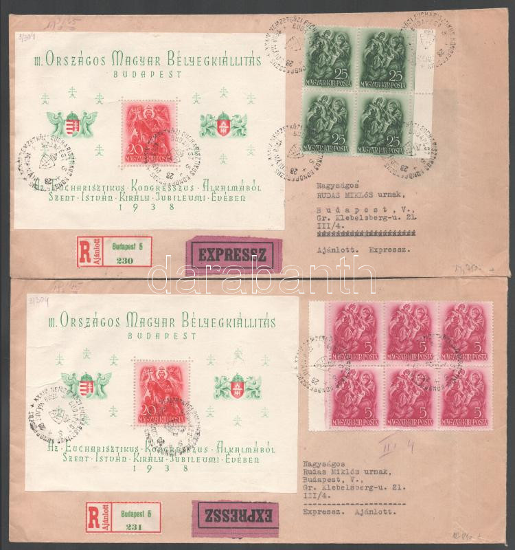 1938 3 db expressz ajánlott levél, köztük teljes Szent István sor és 2 db ORBÉK blokk