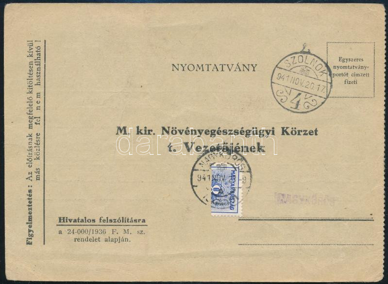 https://www.darabanth.com/en/506-Online-auction/506.0/Hungarian-philately-and-postal-history/Pengo-period-1926-1944~47/1941-Nyomtatvany-Kekporto-8f-felezett-belyeggel-SZOLNOK-NAGYKOROS~II3433279