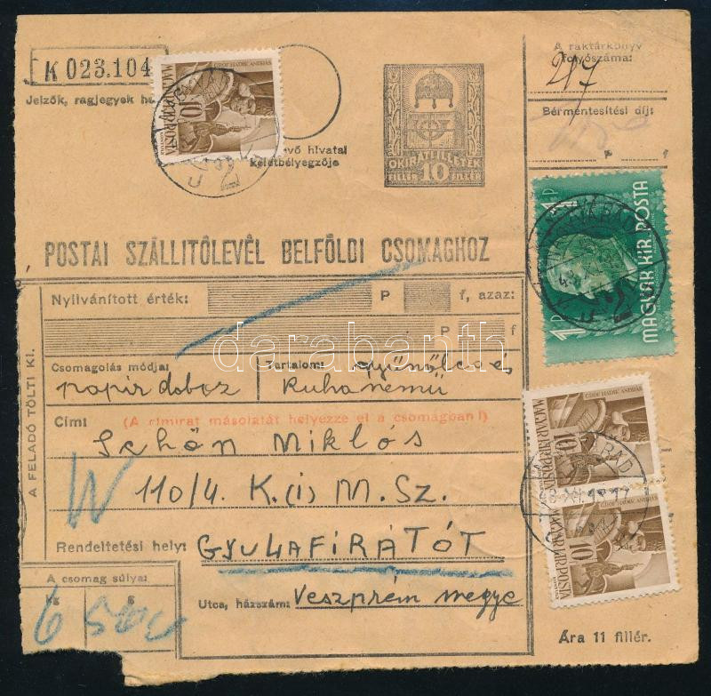 https://www.darabanth.com/en/506-Online-auction/506.0/Hungarian-philately-and-postal-history/Pengo-period-1926-1944~47/1943-Csomagszallito-12-db-belyeggel-NAGYVARAD~II3434559