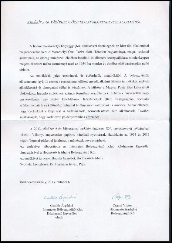 2013 60. Vásárhelyi őszi tárlat emlékív 144. sorszámmal, kísérő levéllel