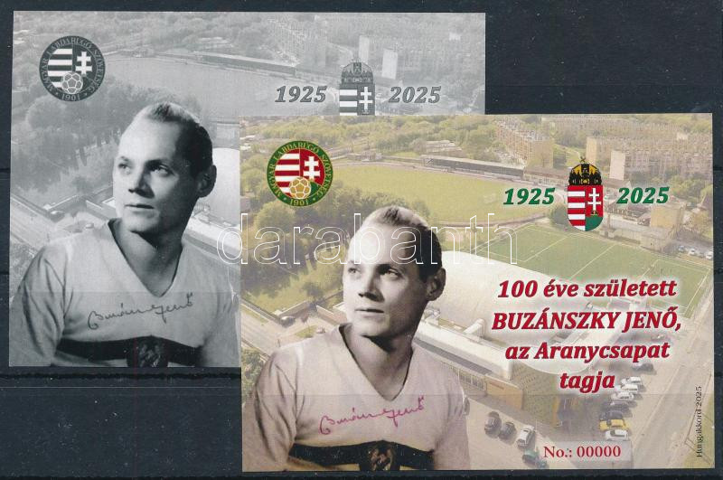 https://www.darabanth.com/en/506-Online-auction/506.0/Hungarian-philately-and-postal-history/Private-souvenir-sheet~60/2025-100-eve-szuletett-Buzanszky-Jeno-emlekiv-par-0000-piros-zold-sorszammal~II3429241