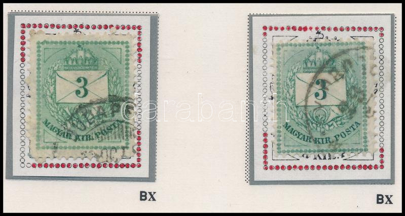 1874 2 db Színesszámú 3kr durva gyöngyjavítással, ritka (ex Orbán, Sebestyén aranyérmes kiállítási anyagából)