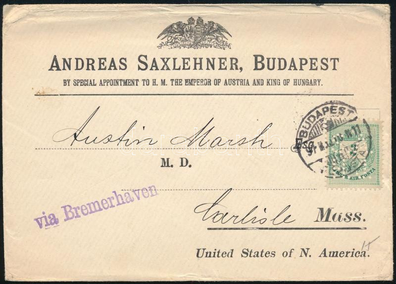 1897 S.A.H.J. céglyukasztásos 3kr Andreas Saxlehner céges nyomtatványon Carlisle / USA-ba