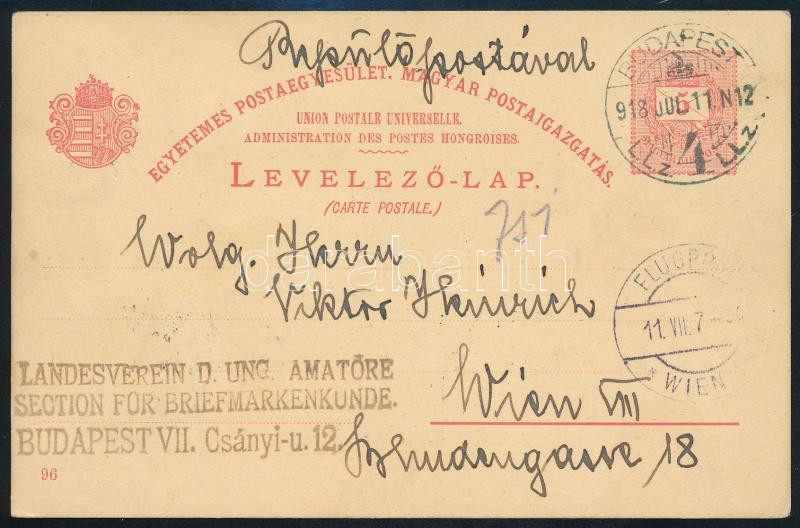 Description: 1918 5kr milleniumi díjjegyes levelezőlap Herkulesfürdő grafikával, légi lapként Bécsbe küldve, a hátoldalon Arató 2 x 10f, Parlament 50f + 1K és Repülő posta 1K 50f/75f bélyegekkel, ritka!