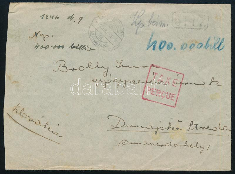 1946 (24. díjszabás) Levél 400.000 BP készpénzes bérmentesítéssel Balatonszárszóról Dunaszerdahelyre / Cover with handwritten franking
