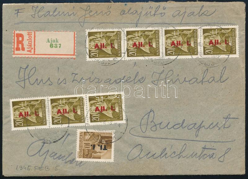 1946.02.05. (7. díjszabás) Ajánlott levél Ajakról Budapestre 8 db Kise...