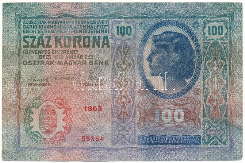 1912. 100K felülbélyegzés nélkül "1865 55354" T:F, tűlyuk