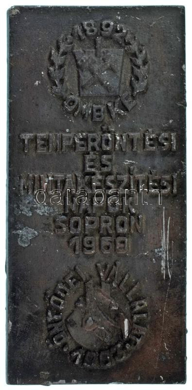 1969. "1892 OMBKE - Temperöntési és Mintakészítési Napok Sopron 1969 - Öntödei Vállalat 1963" egyoldalas, bronzozott ólom plakett (65x134mm) T:XF, karcok