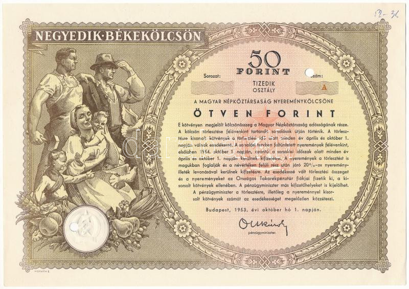 Description: 1953. Budapest "Negyedik Békekölcsön - a Magyar Népköztársaság nyereménykölcsöne " 50Ft értékben, sorozat és sorszám nélkül, szárazpecséttel, lyukasztással érvénytelenítve T:AU,XF jobb felső sarokban kézírásos, tintával írt számjelzés