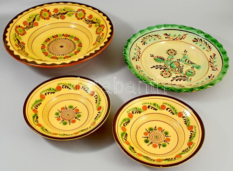 9 darab Karcagi kerámia népi tárgy, közte nagyobb méretű falitál és mi...