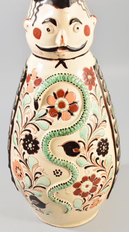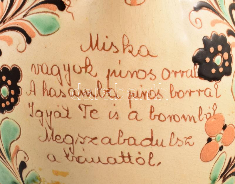 Description: Szabó Karcag nagyméretű feliratos miskakancsó, "Miska vagyok piros orral, A hasamba piros borral, Igyál te is a boromból, Megszabadulsz a bánattól" felirattal. Jelzett, minimális kopással, m: 43 cm