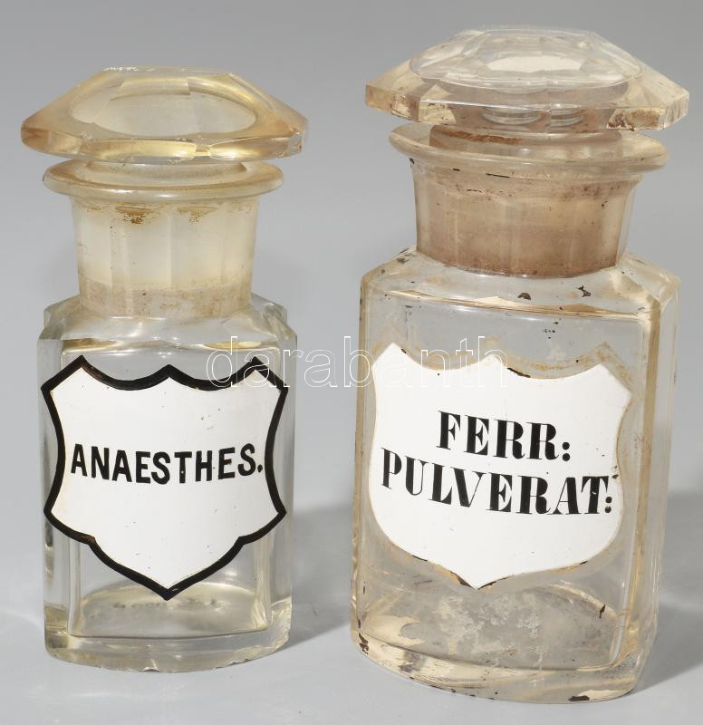 2 darab antik címkés patikai üveg, lepattanással, m: 13,5 cm