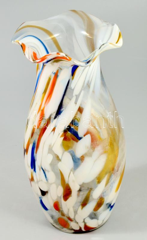 Anyagában örvényesen színezett fodros peremű üvegváza, hibátlan, m: 22,5 cm