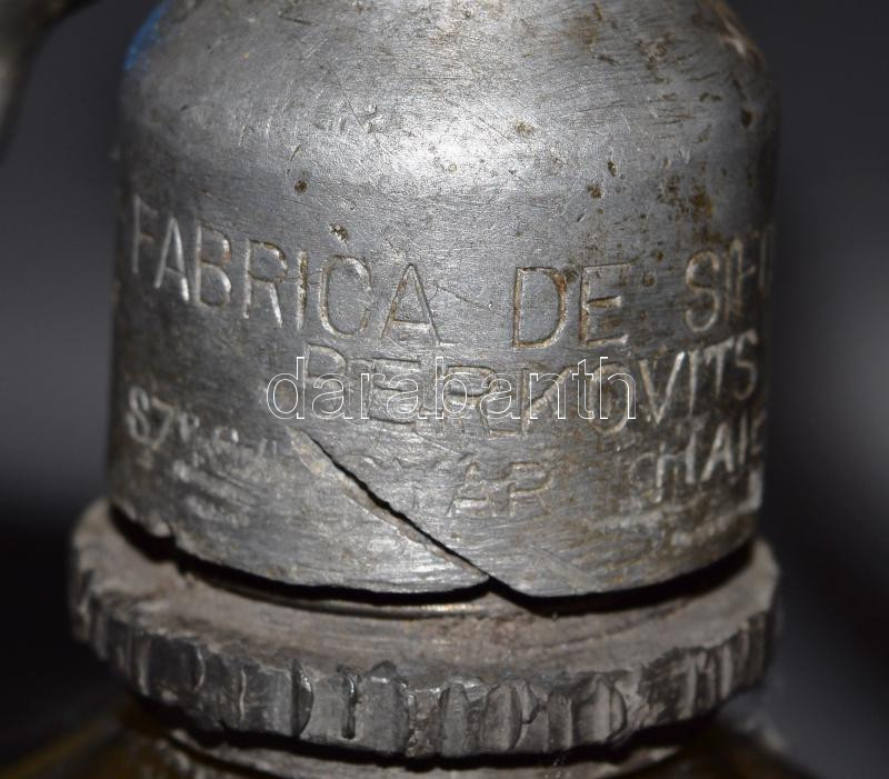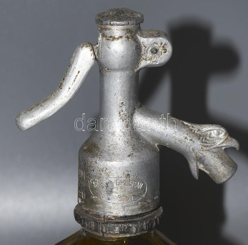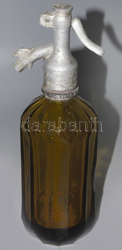 Borostyánszínű bordázott sasfejes szódás üveg, kis pattogzással, m: 27...
