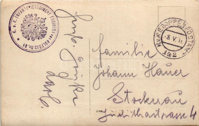 1916 Első világháborús tábori tiszti szoba, katonák, belső / WWI Austro-Hungarian K.u.k. military, field room interior, soldiers. photo + "K.u.K. Infanterieregiment Freiherr von Bolfras Nr. 84" "K.u.k. Etappenpostamt 142" (EK)