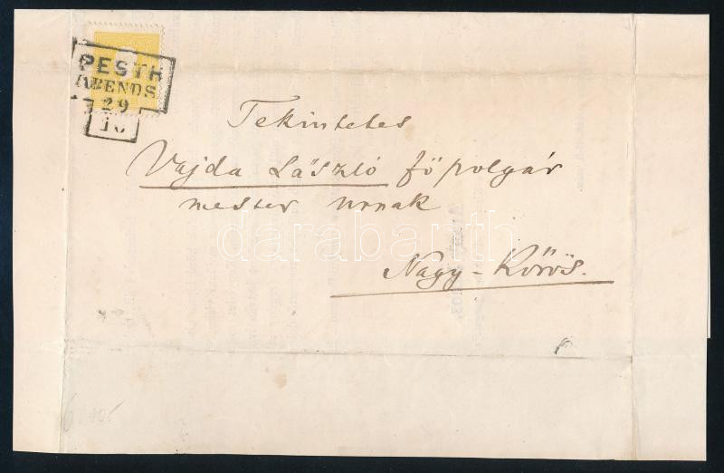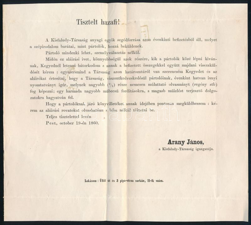 Description: 1860 2kr regiszterhajtással nyomtatványon Arany János a Kisfaludy társaság igazgatója nyomtatott aláírásával "PEST ABENDS" kalapácsbélyegzéssel Nagykőrösre