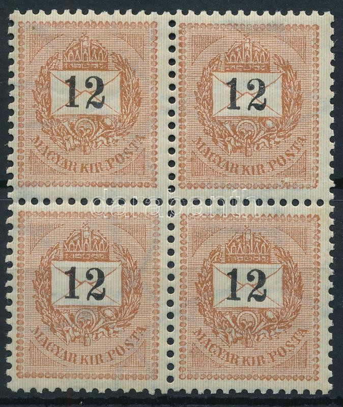 Description: 1889 12kr négyestömb 12 :11 3/4 fogazással, a jobb felső bélyegnél a korona kereszt "folytatódik", ritka lemezhiba! RR! (40.000++) (gumihiba / gum disturbance)